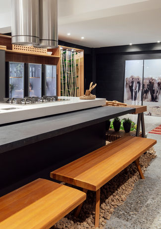 A cozinha é o coração da casa e também um ambiente repleto de memórias afetivas e gastronômicas, capaz de reunir as pessoas. No entanto, para este projeto em especial fomos um pouco além na inspiração para a escolha da persona que ocuparia esta cozinha. Mergulhamos no universo dos consagrados Chefs da gastronomia, a fim de explorar a temática e desenvolver o projeto de uma cozinha com alma, que seria diferente de sua rotina na cozinha industrial. Tendo em vista esta necessidade de “desconfigurar” o ambiente de trabalho para um ambiente que remetesse ao aconchego do lar, desenvolvemos o projeto dentro dos preceitos da arquitetura biofílica, ou seja, trazendo a natureza para dentro do ambiente através da mimetização do espaço interno com a orla do Guaíba. No entanto, trata-se de uma cozinha sensorial com o uso de elementos naturais na sua composição como madeira, vegetação e pedra. Contudo, buscamos homenagear a Chef Zelda Dal’Molin, gerente da cozinha do principal restaurante de comida típica tailandesa da região, o Koh Pee Pee, em Porto Alegre. Acreditamos que a cozinha tem alma e a Chef Zelda nos inspirou pela sua delicadeza e história de vida, unindo também a nossa admiração pela cultura tailandesa. O projeto, no entanto, conta com essa mistura e união do repertório cultural da Chef com a brasilidade do seu lugar de origem e bem viver.